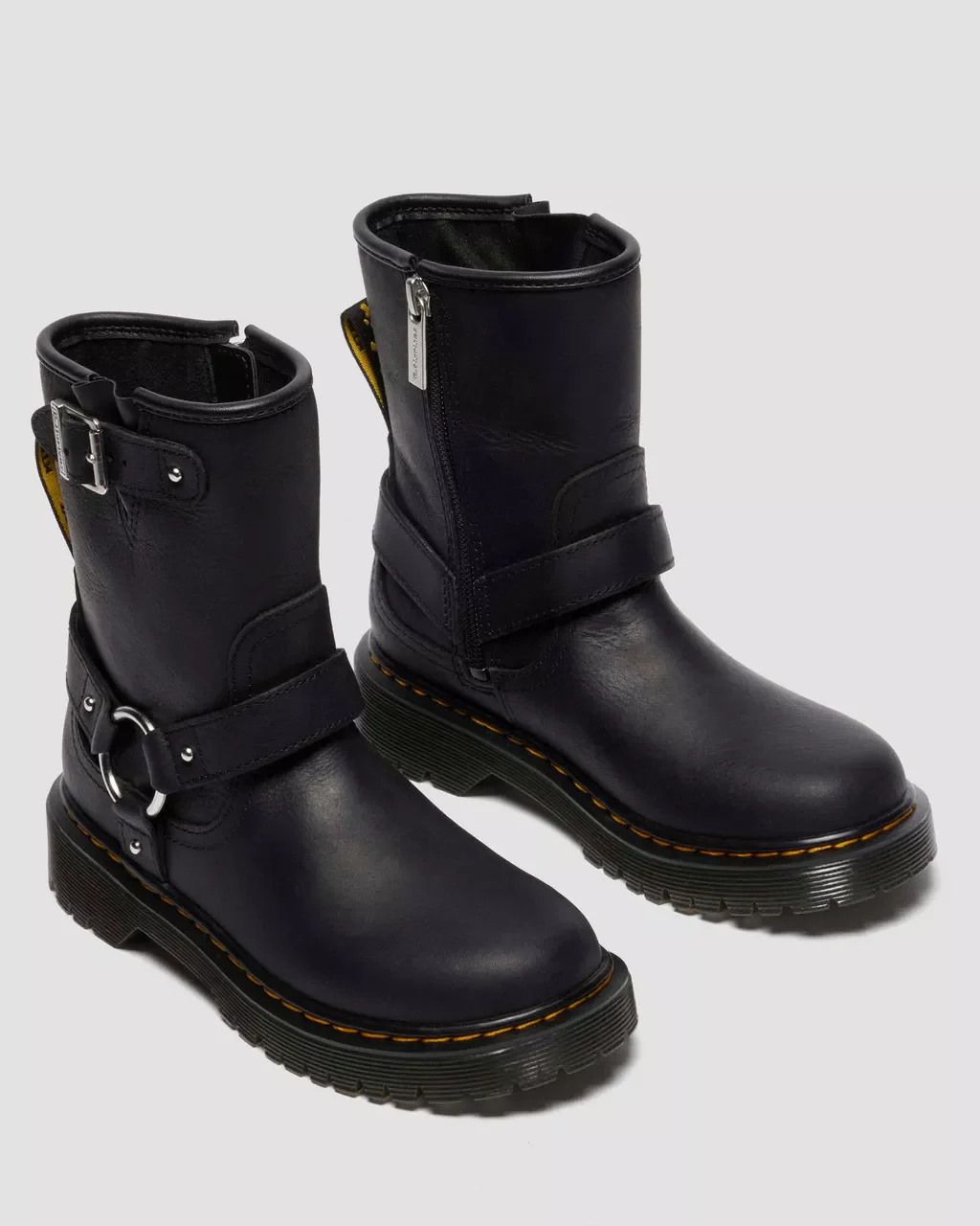 Les bottillons GENAYA pour enfants revisitent l’esprit « biker » emblématique de Dr. Martens en version mini, pensée pour les jeunes au caractère affirmé. Fabriqués en cuir Wyoming épais et résistant, ils se distinguent par leurs boucles argentées ajustables ornées du logo. On retrouve les finitions emblématiques de la marque : la boucle d’enfilage à logo au talon, les fausses surpiqûres jaunes, ainsi qu’une semelle Bex Kids cimentée, dotée des rainures classiques Dr. Martens.
