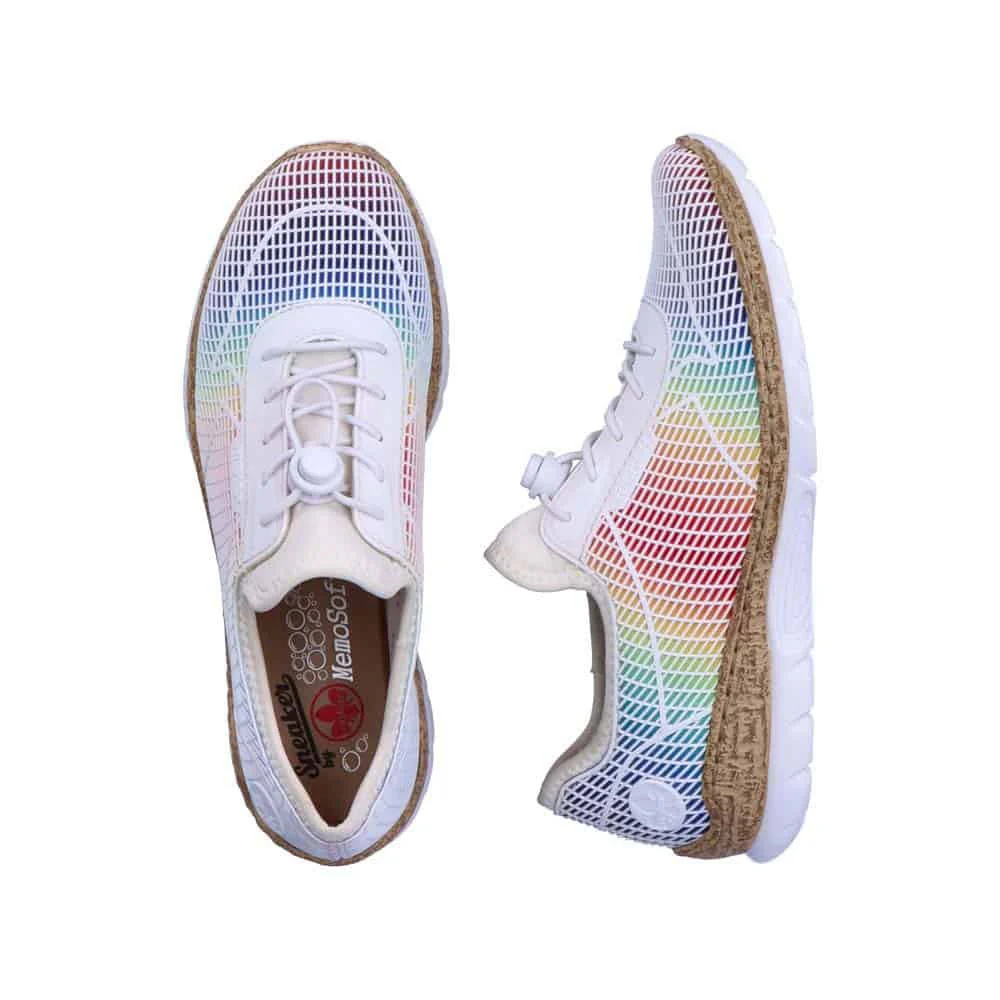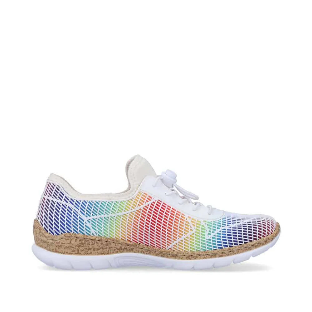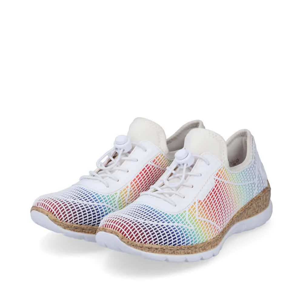 N4270-90 : Cette chaussure de marche à enfiler de Rieker est dotée de lacets élastiques pour aider à maintenir les chaussures sur vos pieds et présente un design arc-en-ciel élégant qui est accrocheur et tendance pour l’été.